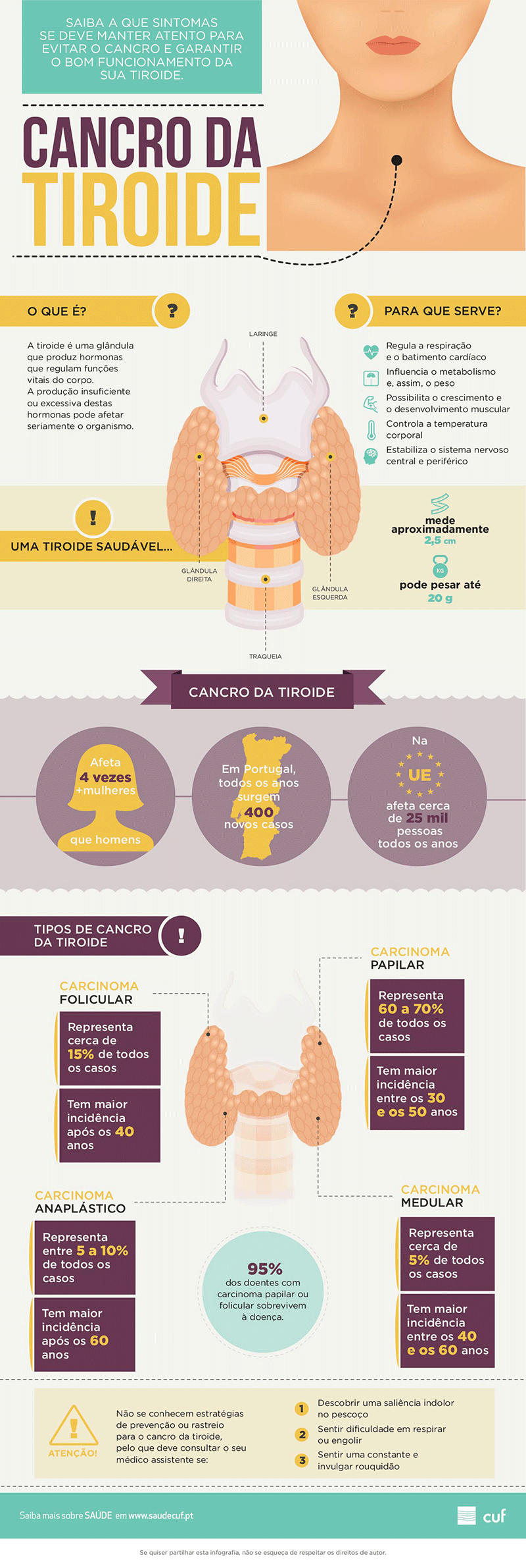 A tiroide é uma glândula com várias funções no nosso organismo - desde a regulação da respiração e do batimento cardíaco ao controlo da temperatura corporal - e, por isso, zelar pela sua saúde é zelar pela nossa saúde de um modo geral. Contudo, são vários os problemas que podem afetar o seu bom funcionamento, entre os quais os de origem cancerígena. Aprenda mais sobre cada um dos cancros da tiroide e descubra os sinais a que deve estar atento para se proteger.