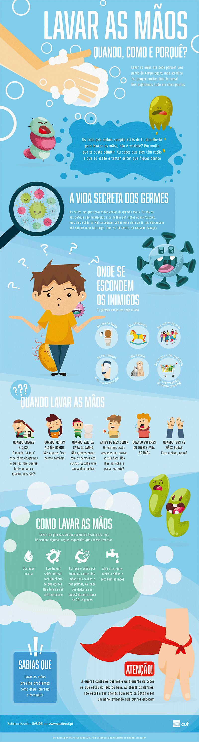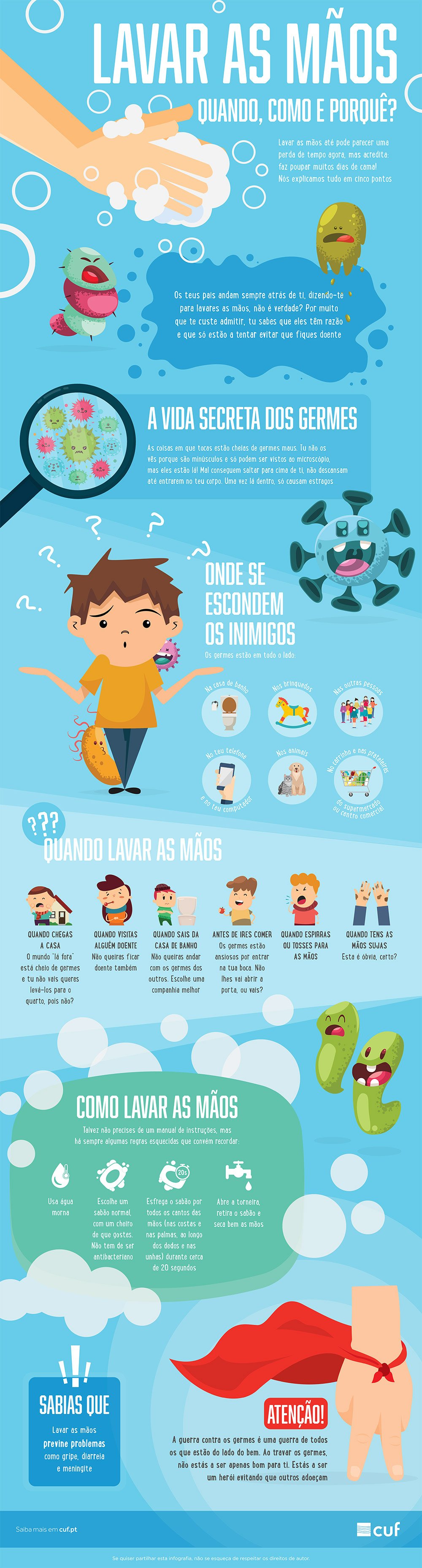 Com a ajuda desta infografia, ajude o seu filho a conhecer a vida secreta dos micróbios, os locais onde normalmente se encontram, em que situações devem mesmo lavar as mãos e como o devem fazer para ficar com elas bem limpas.