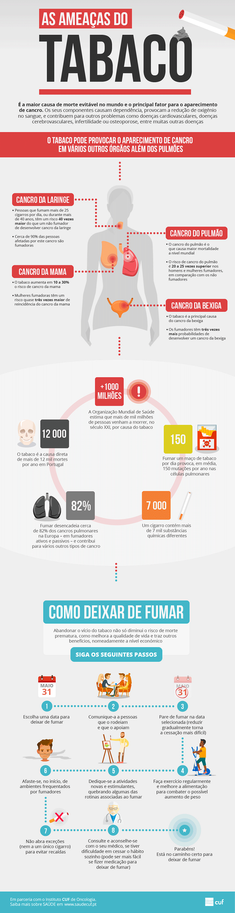 É a maior causa de morte evitável no mundo - só em Portugal é diretamente responsável por mais de 12 mil mortes por ano - e o principal fator para o aparecimento de cancro (que não se fica só pelo do pulmão, há muitos mais). Se é fumador, dificilmente encontrará dois motivos mais fortes do que estes para o incentivar a largar este hábito. Mas fique a saber que os malefícios do tabaco para a nossa saúde são inúmeros e não se ficam por aqui.