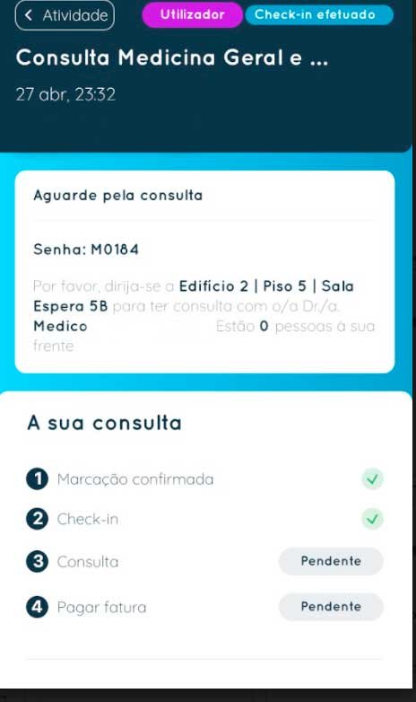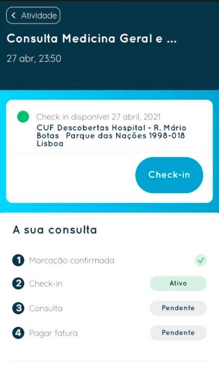 Na página de início do My CUF, aparece o atalho para realizar Check-in, e no Menu atividade, separador de marcações ao clicar na consulta ou exame, consegue consultar o Check-in disponível.