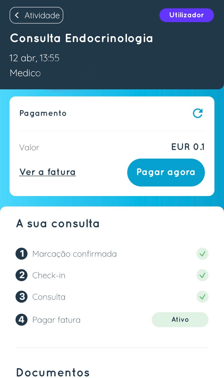 - Menu atividade, separador de marcações: ao clicar na consulta ou exame, consegue aceder à fatura